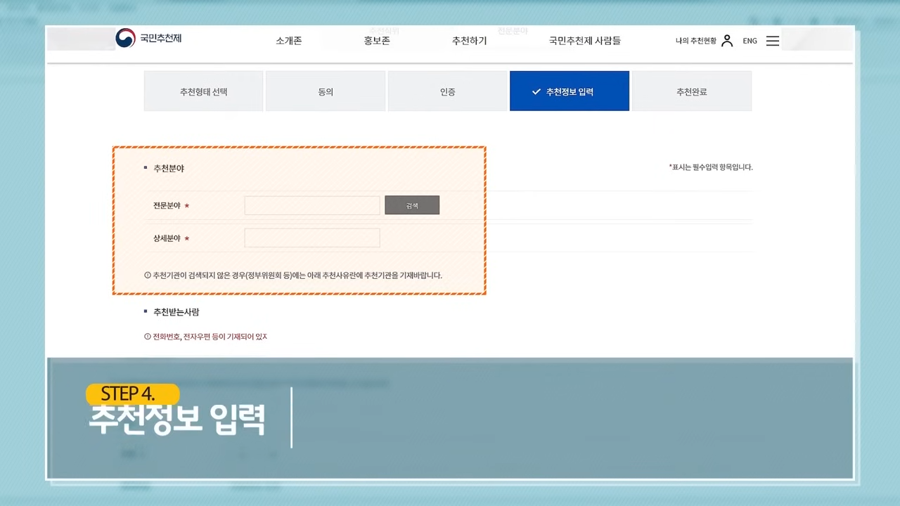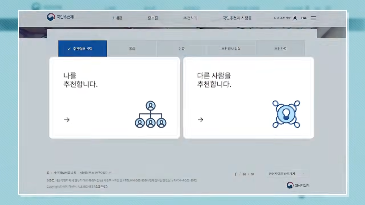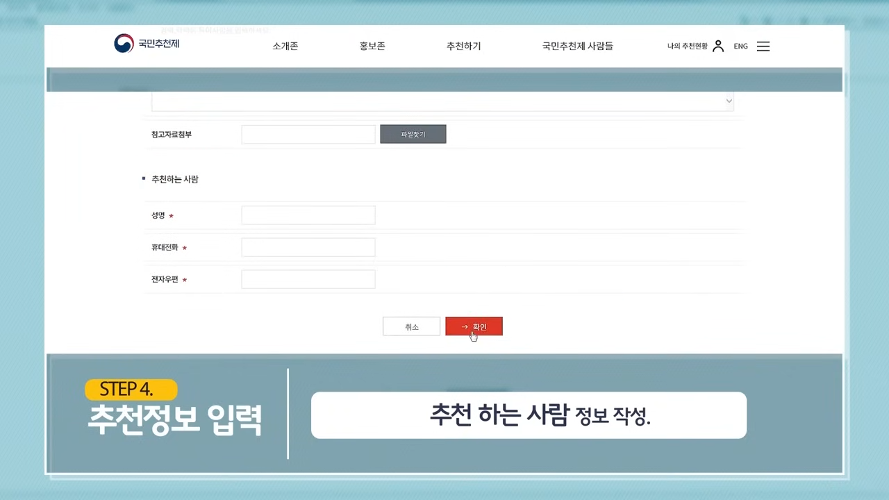 국민추천제 홈페이지에서 추천은 아래 절차를 따라 진행하면 됩니다.