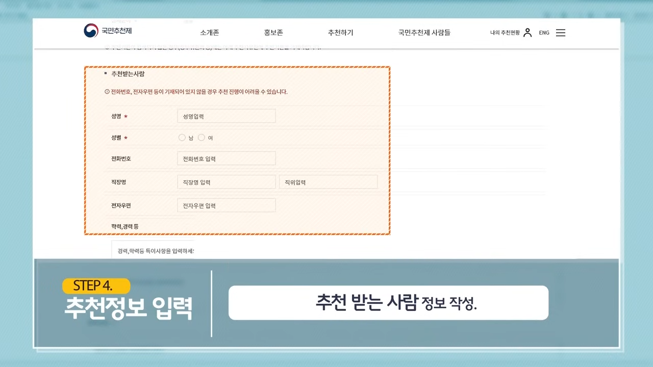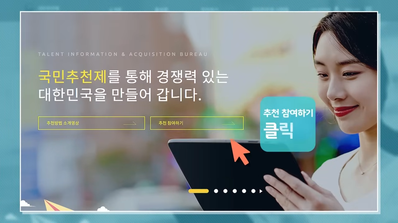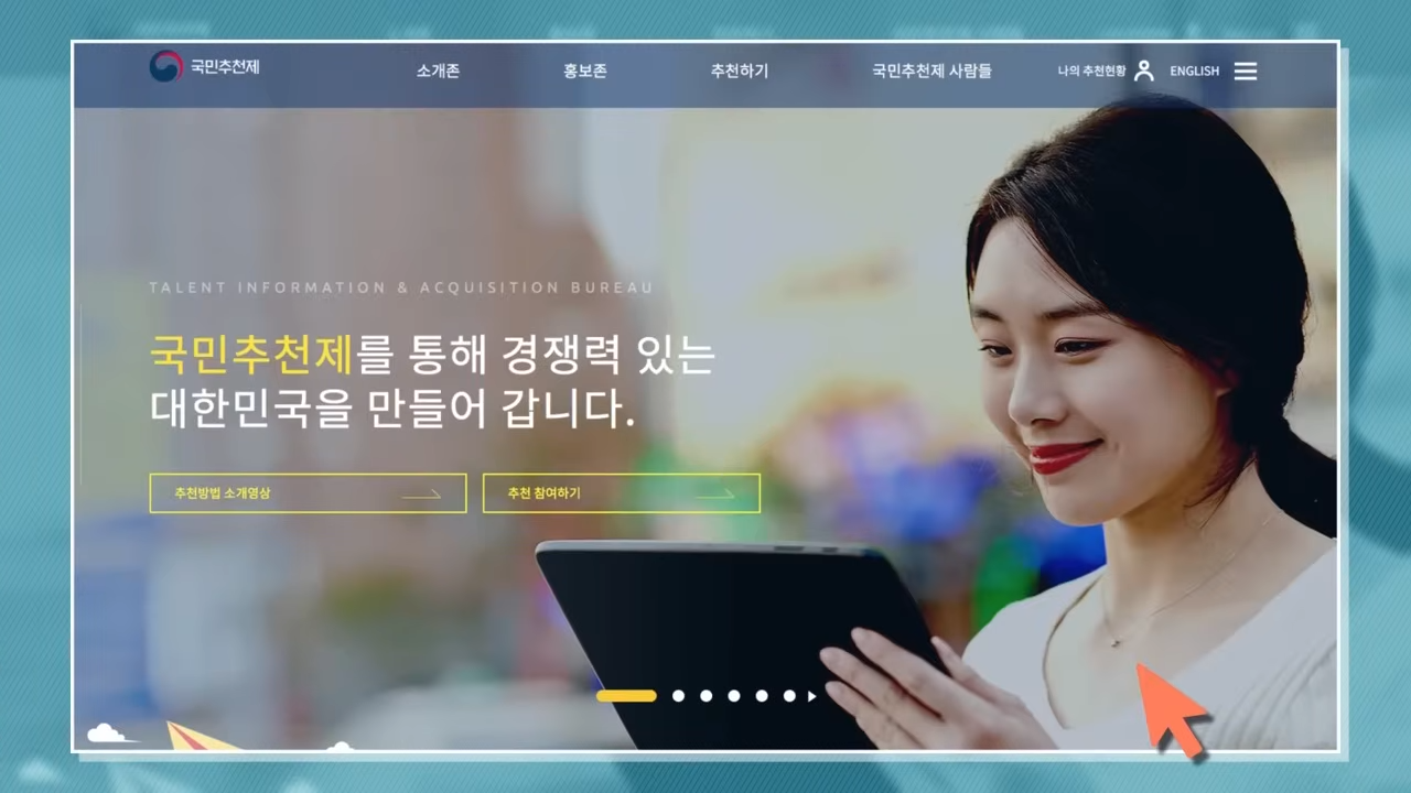 국민추천제 홈페이지에서는 사회 각 분야에서 쌓은 지식과 경험을 바탕으로 국가 발전에 기여할 수 있는 인재를 추천할 수 있습니다. 본인 추천도 가능하니 스스로 지원하고 싶은 분들도 활용해보세요.