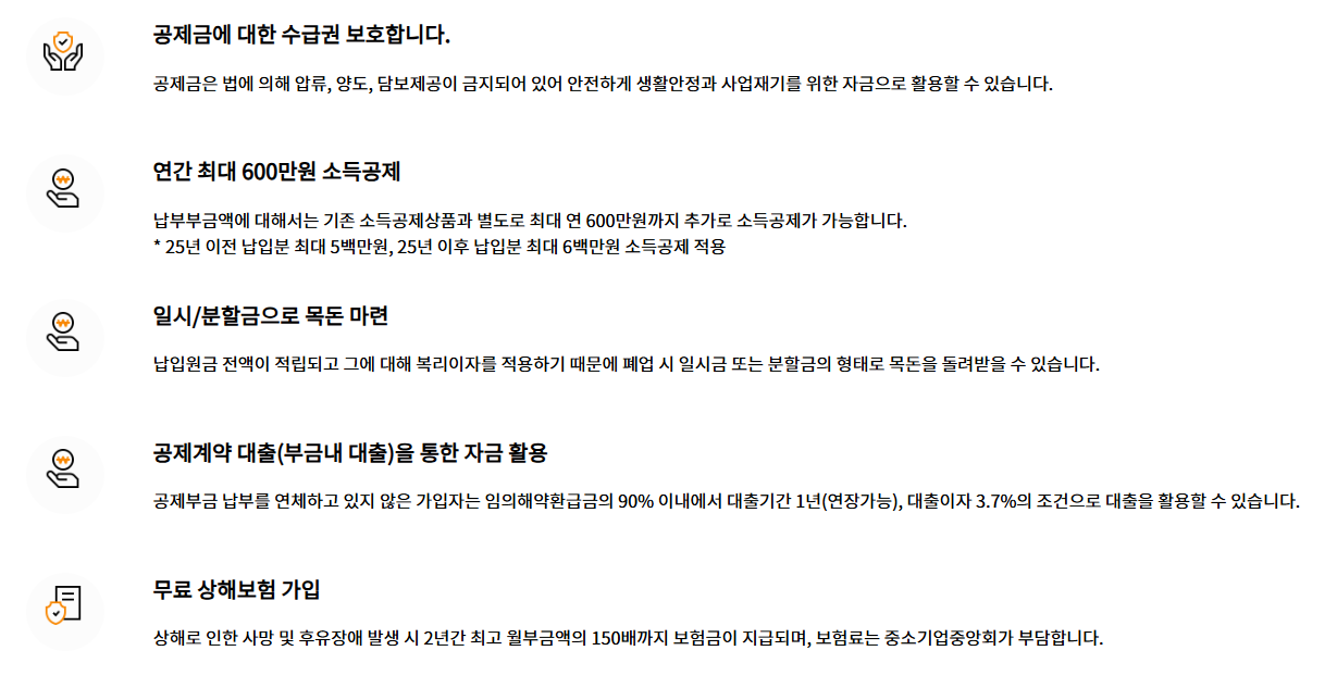 노란우산공제 장단점 가운데 대표적인 장점은 세액공제, 압류 방지, 복리이자다. 적립금 전액이 채권·압류에서 보호되기 때문에 혹여 사업이 어려워져도 최소한의 생활안정 자금을 지킬 수 있다.