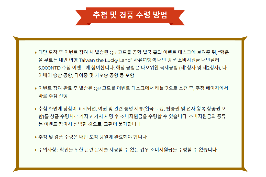 현장에서 당첨되면 원하는 바우처를 선택해 수령한다. 여권·항공권·입국 도장이 필수이므로 캐리어에 넣지 말고 기내에서 바로 꺼낼 수 있게 준비하자. 대만 여행지원금 신청 후 바우처는 도착 2시간 이내 수령해야 하고, 수령일 포함 90일 안에 써야 효력이 유지된다.