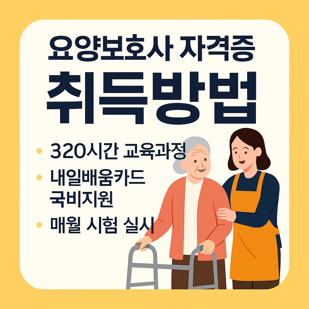 요양보호사 자격증 취득방법을 알아보세요. 교육 이수부터 시험, 실습, 국비지원까지 320시간의 과정과 내일배움카드 혜택, 매월 시험 일정까지 한눈에 정리했습니다.