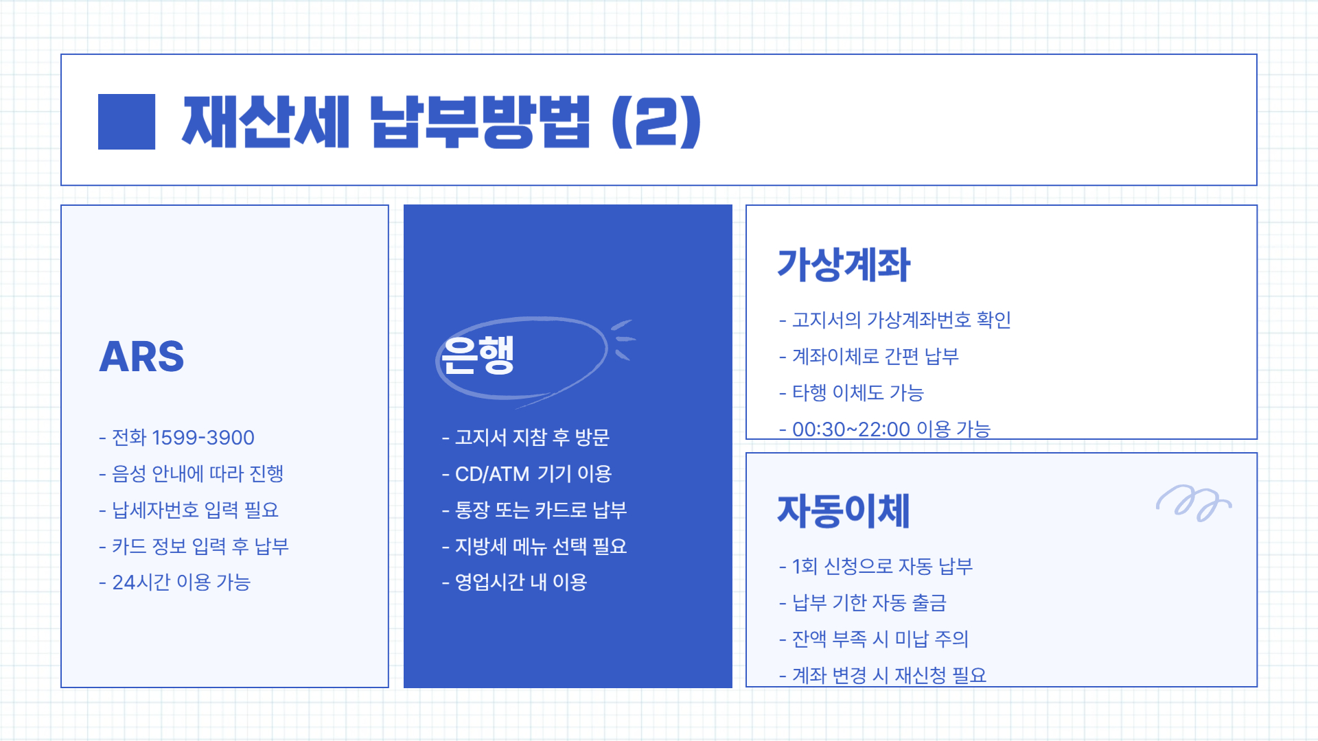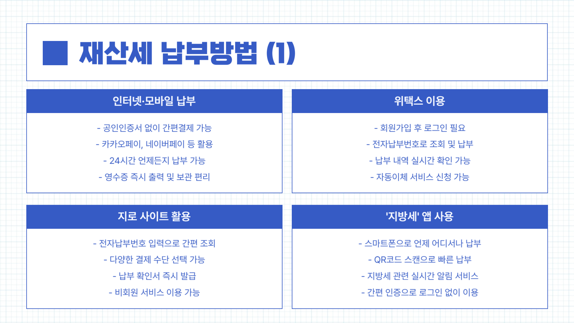 이렇게 다양한 재산세 납부방법을 기억해 두면 상황에 맞춰 5분 안에 처리할 수 있다.