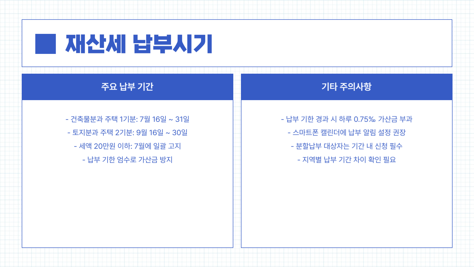 재산세 납부방법을 살피기 전에 기한부터 챙기자. 건축물분과 주택 1기분은 7월 16일부터 31일까지, 토지분과 주택 2기분은 9월 16일부터 30일까지 낸다.