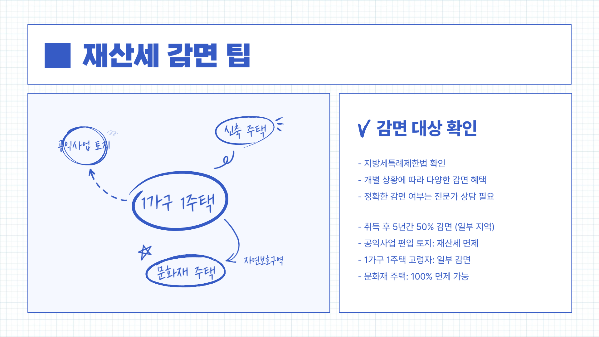 재산세가 250만원을 넘으면 7월 31일까지 신청해 두고 9월에 한 번 더 내는 분할납부 제도를 활용하자. 250만~500만원 사이는 초과분만, 500만원이 넘으면 절반까지 나눌 수 있어 한꺼번에 목돈이 빠져나가는 부담을 덜어 준다. 또한 신축 주택, 공익 사업 편입 토지 등은 감면 대상이 될 수 있으니 고지서를 받으면 지자체 세무과에 문의해 보자.