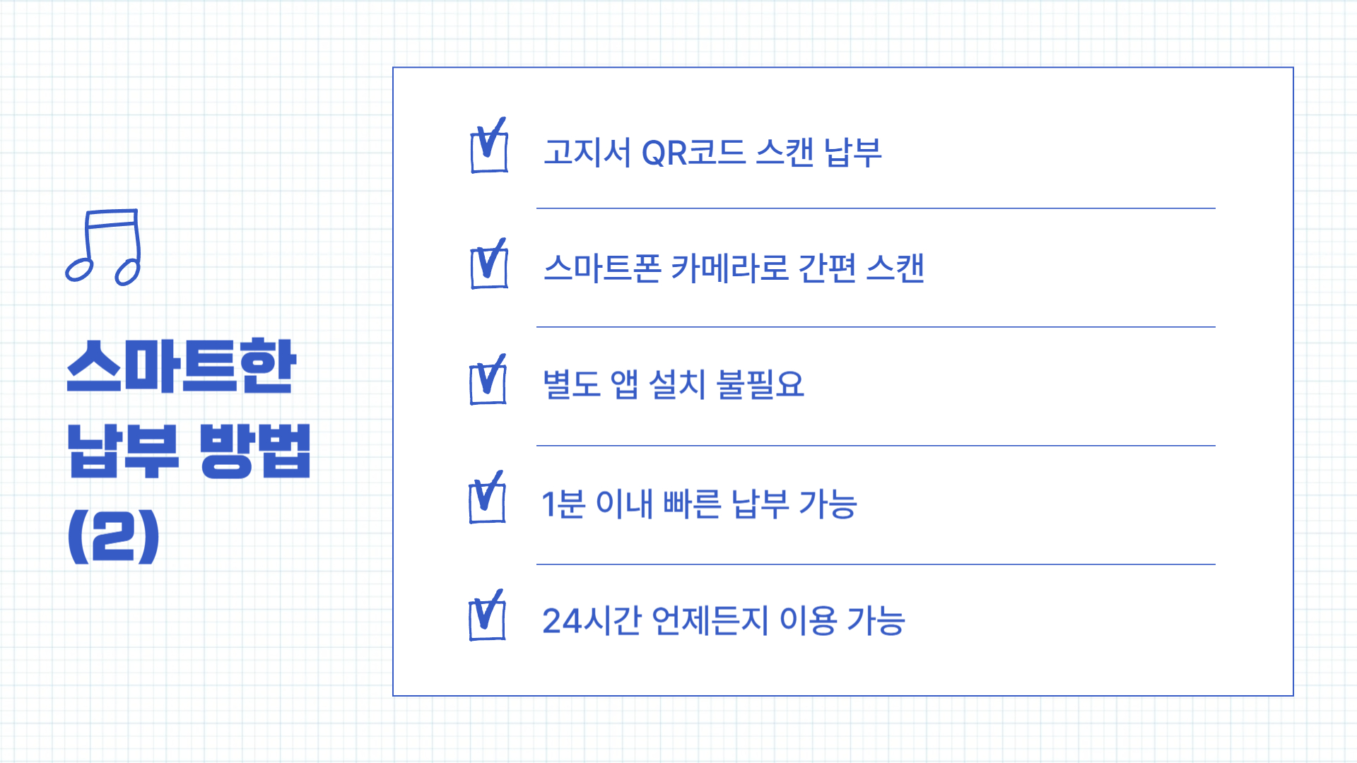 네이버페이·토스도 비슷한 기능을 제공하니 익숙한 플랫폼을 골라 두면 좋다. 또 고지서 QR코드를 스마트폰 카메라로 스캔하면 납부 화면이 바로 열리므로, 컴퓨터가 없는 상황에서도 1분 안에 끝낼 수 있다.