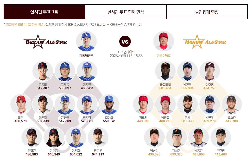 KBO 올스타전 투표의 재미 중 하나는 바로 중간 집계 결과 발표입니다.