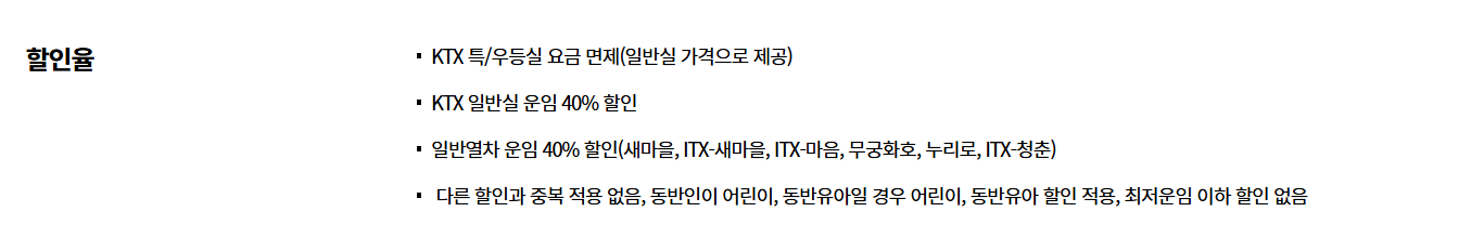 처음에는 차를 가지고 갈까 고민했지만 장시간 운전이 부담스러워서 KTX를 선택하게 되었어요. 알아보니 KTX 임산부 할인 혜택이 있더라고요. 임산부 본인과 동반 1인까지 KTX 일반실 운임의 40% 할인을 받을 수 있어요. 정말 알차죠?